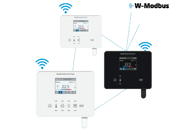 Gracias a la comunicación Modbus inteligente, los dispositivos pueden conectarse fácilmente en red o integrarse sin problemas en los sistemas de gestión de edificios existentes. Las unidades operativas de las habitaciones ponen los valores de consigna a disposición del BMS a través del Modbus cableado convencional o a través del Wireless Modbus inalámbrico basado en radio.