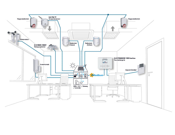 - Modbus / W-Modbus (Funk) zur Erfassung der Raumwerte sowie zur übergeordneten Kontrolle/Steuerung