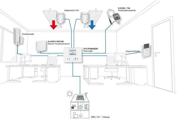 RYMASKON® verfügt über Sensoren zur Messung von Temperatur, Feuchte und Luftqualität, um den aktuellen Zustand des Raumes zu überprüfen. Die Raumbediengeräte steuern Heizung, Kühlung, Lüftung, Beschattung und Beleuchtung via Modbus-Kommunikation mit der GLT.