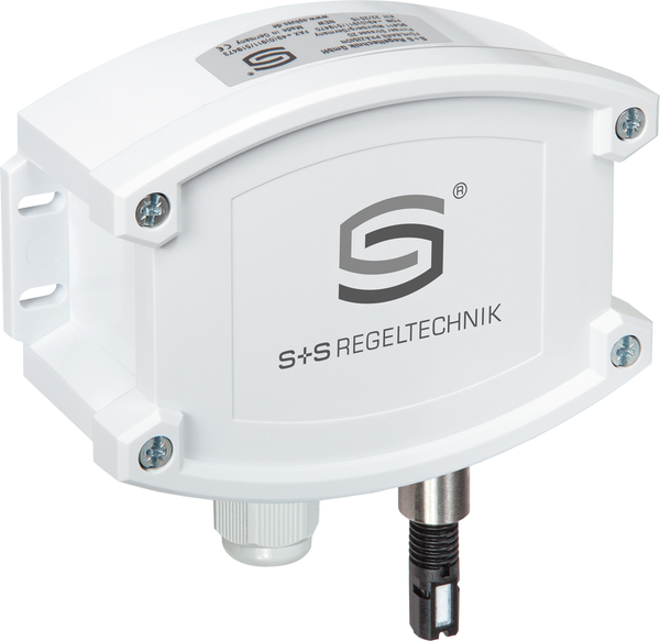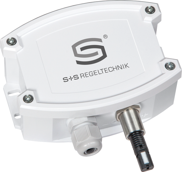| Surface-mounted sensor HYGRASREG® AFTF-45 with sealed sensor technology (IP 65), with active and switching output, impact-resistant plastic housing with quick-locking screws, cable gland, plastic sintered filter, optionally with ⁄ without display, for recording relative humidity (0...100 % RH) and temperature (4 switchable measuring ranges, max. 0...+100 °C) as well as for determining various humidity measurement technology parameters. The measuring transducer converts the measured variables into a standard signal of 0 - 10 V or 4...20 mA. The device is specially designed for use in harsh environmental conditions (95...99 % RH). A long-term stable, digital humidity and temperature sensor with high impermeability (IP 65 encapsulated) is used. The following parameters are calculated internally from these measured variables and can be called up via the OUT3 output: absolute humidity, mixing ratio, dew point and wet bulb temperature (switchable via DIP switch). With device variant AFTF-45 LCD, up to three parameters can be shown on the display (adjustable via DIP switch). The sensor is used in medical technology, refrigeration technology, control technology, air conditioning and clean room technology. The sensor is calibrated at the factory; fine adjustment by a specialist is possible depending on the environment. |