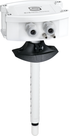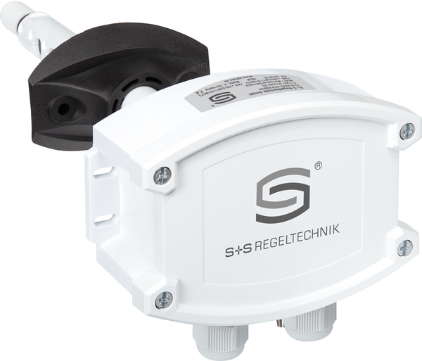 Maintenance-free microprocessor-controlled PREMASGARD® 814x - Modbus (series) with Modbus connection, in an impact-resistant plastic housing with quick-locking screws, connection piece for pressure hose (Ø 6 mm), plastic sintered filter (replaceable), optionally with ⁄ without display, for precise measurement of relative humidity (0...100 % RH) and temperature (-35...+80 °C) in ducts and for measuring the differential pressure (max. ± 7000 Pa) in air. International unit system SI (default) is set to Imperial (via Modbus). Incl. mounting flange and connection set ASD-06 (2 m connection hose, two pressure connection nipples, screws).