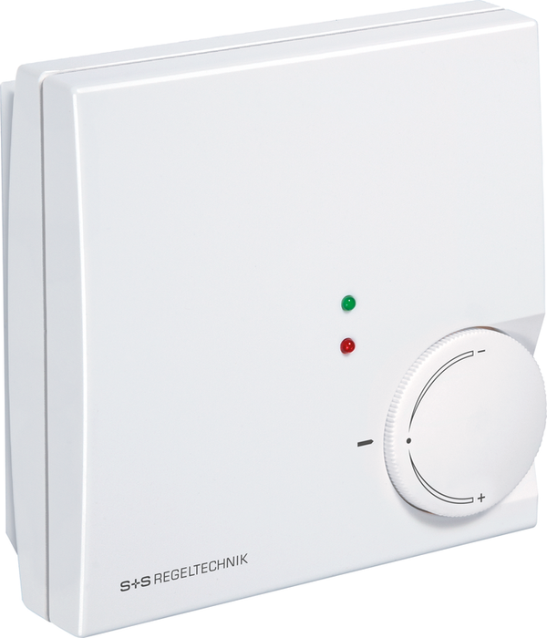 Electronic room thermostat/air conditioning controller THERMASREG® RTR - S for temperature control or monitoring, with 0-10 V output for heating and cooling, optionally as a continuous climate controller with manual fan speed control, setpoint adjustment and LED operating displays.