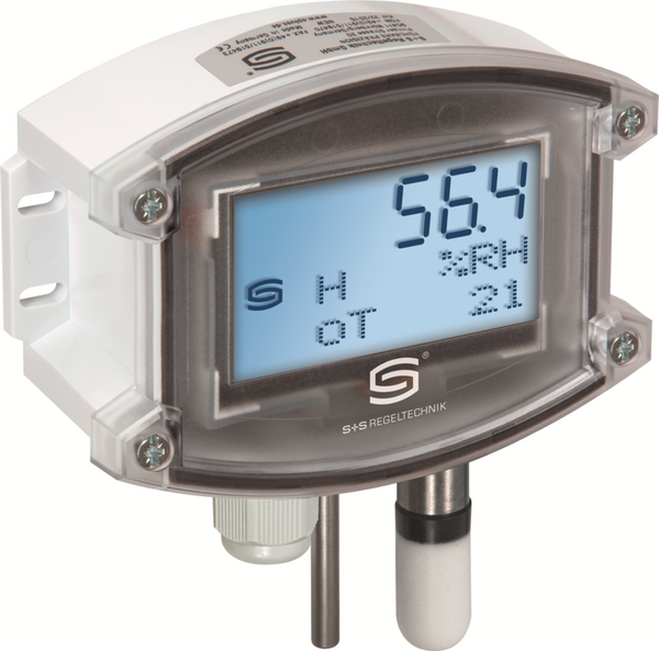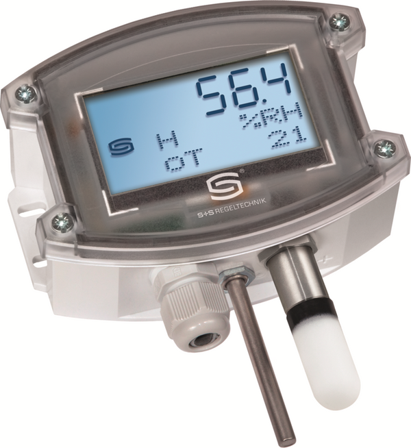 Condensation-protected surface-mounted sensor HYGRASREG® AFTF-35 with active and switching output, housing made of impact-resistant plastic with quick-locking screws, cable gland, plastic sinter filter (replaceable), optionally with ⁄ without display, for recording relative humidity (0...100 % RH) and temperature (4 switchable measuring ranges, max. 0...+100 °C) as well as for determining various humidity measurement technology parameters. The measuring transducer converts the measured variables into a standard signal of 0 - 10 V or 4...20 mA.