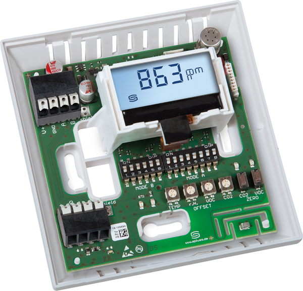 Multifunctional room climate sensor AERASGARD® RFTM-LQ-PS-CO2-Modbus (maximum expansion stage) with Modbus connection, in an attractive plastic housing with snap-on cover, lower part with 4-hole mounting, optionally with ⁄ without display, type variant RFTM-CO2-Modbus optionally with ⁄ without setpoint potentiometer. The room sensor is used to record the measured variables humidity (0...100 % RH), temperature (0...+50°C), air quality (VOC) (0...100 % ), particulate matter (PM) (0...1000 µg/m3) and CO2 content (0...5000 ppm) and as a room control unit (% setpoint). International system of units SI (default) can be switched to Imperial (via Modbus). The following parameters can be called up via Modbus: Temperature, relative humidity, air quality (VOC), particulate matter (PM) and carbon dioxide (CO2). The entire indoor climate can be effectively monitored and controlled with just one device. This enables energy-saving, needs-based room ventilation and thus a reduction in operating costs and an increase in well-being. It can be used in offices, hotels, conference rooms, apartments, stores, etc. One sensor per 30 m² of room area is recommended.