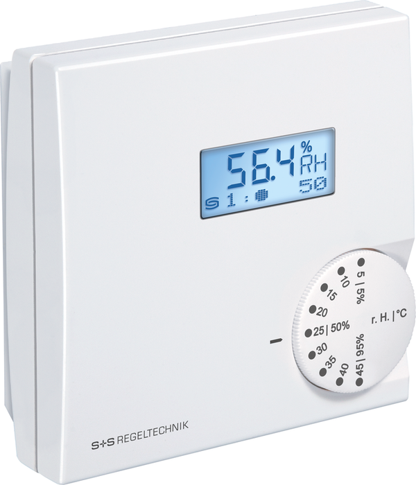 Electronic room hygrostat and/or room thermostat HYGRASREG® RHT-30 with one continuous and two switching outputs, adjustable switching thresholds, optionally with/without display to indicate the actual humidity and/or actual temperature (accuracy class ± 2.0 % RH). The setpoints can be assigned to the relative humidity and/or temperature.