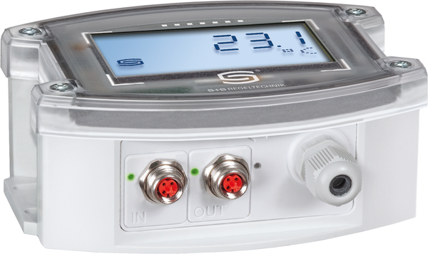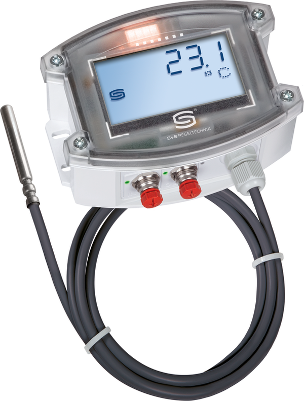 Networkable sleeve temperature transmitter THERMASGARD® HFTM - EtherCAT P with M8 plug connector (EtherCATP-coded), Bluetooth-capable, in impact-resistant plastic housing with quick-release screws, optionally with/without display and bar graph, cable sensor with stainless steel sleeve.