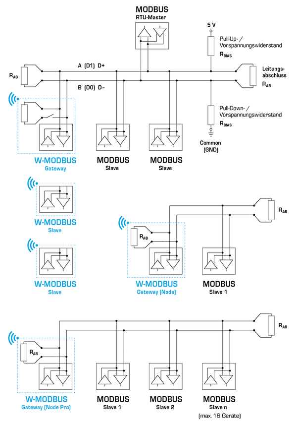 Todos W-Modbus Descubra los sensoresEn el W-Modbus-Red hasta 100 participantes pueden comunicarse entre sí a larga distancia (hasta 500 m de campo libre) en una pasarela. Un estándar W-Modbus-garantiza la compatibilidad con todos los W-Modbus-dispositivos.
