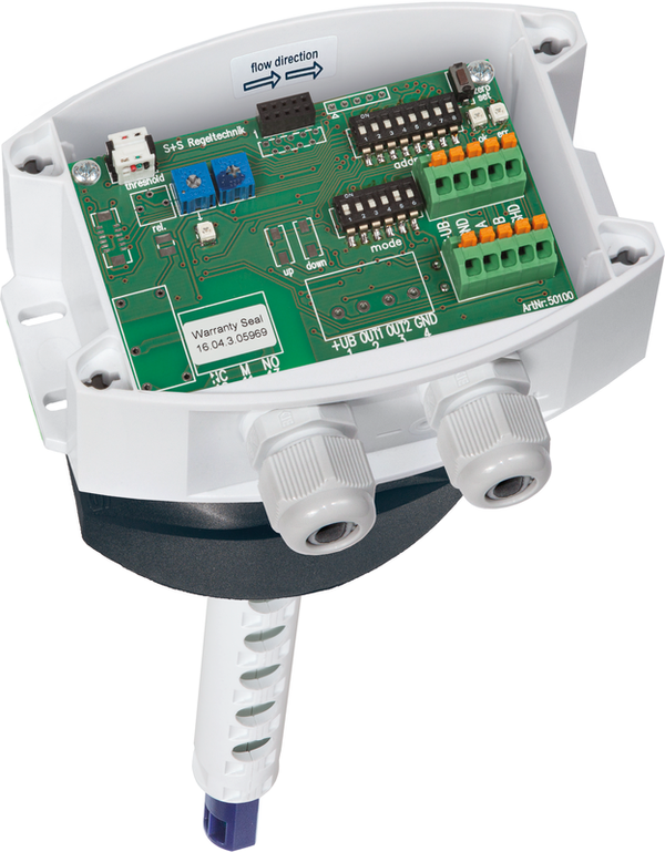 Sensor de caudal de aire en conductos calibrable RHEASGARD® KLGF - Modbus con conector Modbus, carcasa de plástico resistente a los golpes con tornillos de cierre rápido, con prensaestopas (conector M12 opcional según DIN EN 61076-2-101) opcionalmente con / sin pantalla, para determinar la velocidad del caudal (0,1...20 m/s).