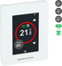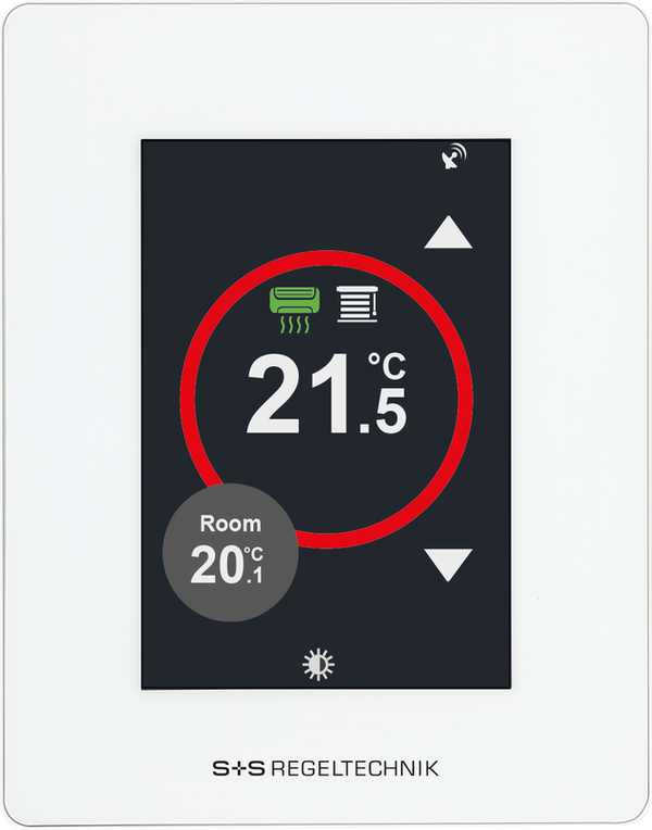 El modelo básico RYMASKON 510 Termostato con pantalla táctil en color (3,5"), en una carcasa blanca, dispone de un sensor de temperatura y humedad integrado, 2 entradas de resistencia (para sensores de temperatura externos NTC10K), 1 entrada digital, 1 salida de relé (7A) y opcionalmente con conexión Modbus o BACnet. Las unidades de control de estancias se utilizan para controlar la calefacción/refrigeración directamente a través del relé (control de 2 puntos), así como la iluminación, el aire acondicionado y la protección solar (1 zona) a través del bus.