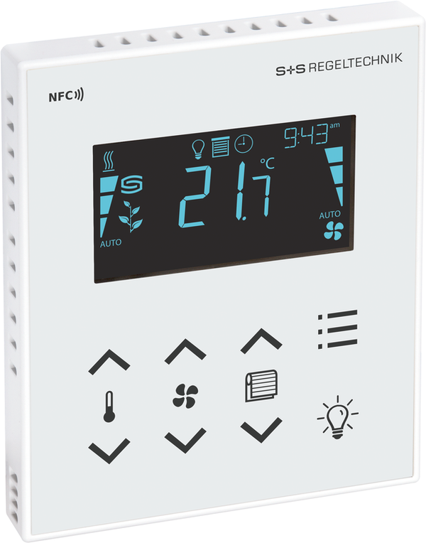 L'écran multifonctionnel spécialement conçu pour la commande de la pièce est graduable et offre un affichage clair de toutes les données spatiales disponibles au moyen de symboles intuitifs. Outre l'heure, la date et les paramètres climatiques (température, humidité, point de rosée, teneur en CO2), d'autres fonctions telles que le fonctionnement du ventilateur ou l'occupation de la pièce peuvent être affichées. La couleur du rétroéclairage peut être adaptée au design de la pièce.
