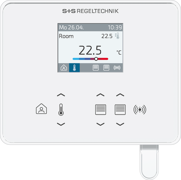 L'interface de communication Modbus ou W-Modbus permet de modifier et de surveiller à tout moment les paramètres climatiques sur le régulateur via la GTC. De plus, les fonctions de protection solaire (brise-soleil orientables, stores vénitiens) ou d'éclairage (avec fonction de variation) peuvent être commandées via le bus. L'affichage optique est assuré par un écran TFT 2", la commande par des touches capacitives (Touchkeys).