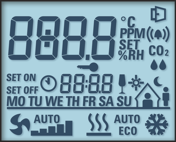 Il display multifunzionale, appositamente progettato per il funzionamento in ambiente, è dimmerabile e fornisce una chiara visualizzazione di tutti i dati disponibili in ambiente mediante simboli intuitivi. Oltre all'ora, al giorno della settimana e ai parametri climatici (temperatura, umidità, punto di rugiada, contenuto di CO2), è possibile visualizzare anche altre funzioni, come il funzionamento del riscaldamento/raffreddamento e del ventilatore, l'apertura delle finestre, l'illuminazione, l'allarme, il blocco delle chiavi o l'occupazione della stanza.