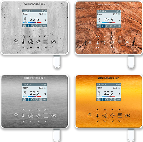 L'interfaccia di comunicazione Modbus o W-Modbus consente di modificare e monitorare in qualsiasi momento i parametri climatici del controllore tramite il BMS. Inoltre, le funzioni di protezione solare (tende esterne, veneziane) o la luce (con funzione di oscuramento) possono essere controllate tramite il bus. La visualizzazione avviene su un display TFT da 2" e il funzionamento avviene tramite pulsanti capacitivi (tasti a sfioramento).