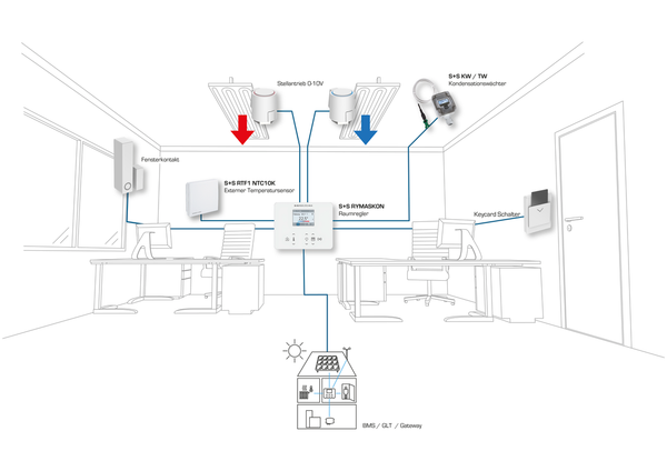 Le unità di comando ambiente della serie RYMASKON® 1000 / 2000 / 3000 sono progettate per il controllo (fino a 5 zone climatiche) di ambienti residenziali, alberghieri e uffici e regolano individualmente i livelli di riscaldamento, raffreddamento e ventilazione degli interni. Le varianti del regolatore possono essere utilizzate come dispositivi autonomi grazie alle funzioni di controllo PI, PWM o a 2/3 punti integrate. La famiglia di prodotti si distingue per il design elegante, il funzionamento intuitivo e le numerose combinazioni possibili dei singoli componenti.