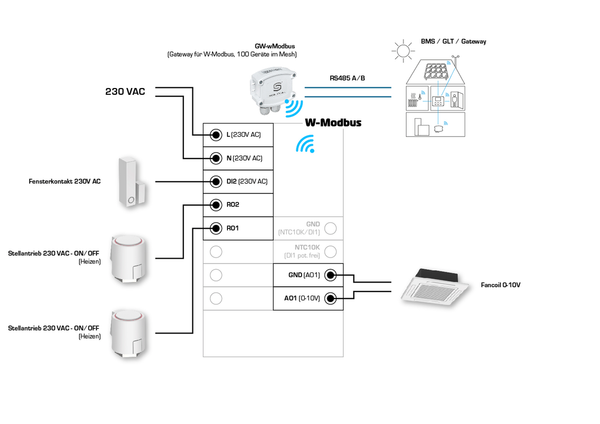 Oltre al sensore di temperatura e umidità integrato, sono disponibili sensori opzionali per CO2 e VOC. È inoltre disponibile un ingresso per un sensore di temperatura passivo (NTC10K) e un ingresso per un contatto a potenziale zero. Ad esempio, è possibile collegare un contatto finestra o un monitor di condensa. In questo modo sono disponibili tutte le opzioni per una climatizzazione flessibile e personalizzata degli ambienti.
