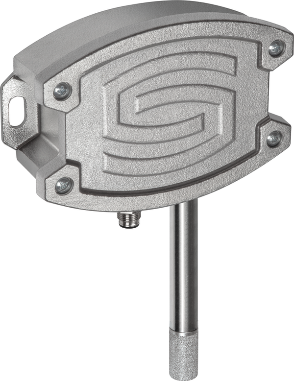 Kalibrierfähiger Außen-Feuchte- und -Temperaturtransmitter HYGRASGARD® AFTF - 20-VA (± 1,8 %) mit Metall-Sinterfilter, robustem Gehäuse aus Edelstahl V4A, wahlweise mit/ohne Display, mit Kabelverschraubung oder M12-Steckverbinder nach DIN EN 61076-2-101.