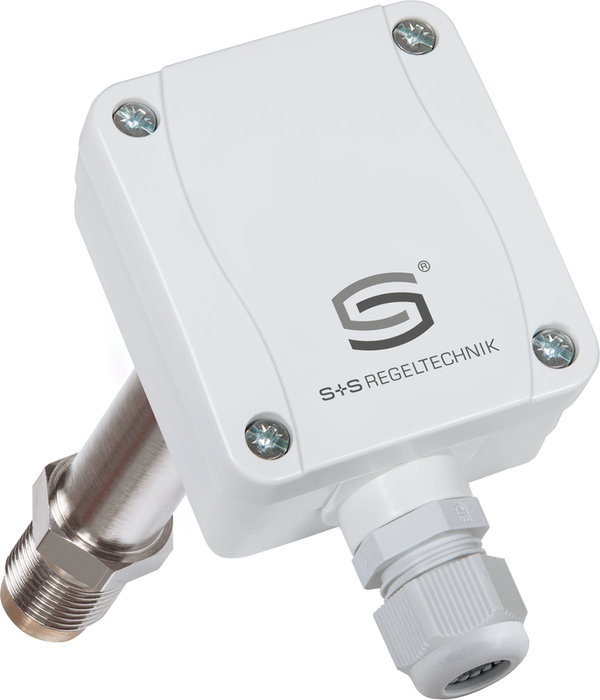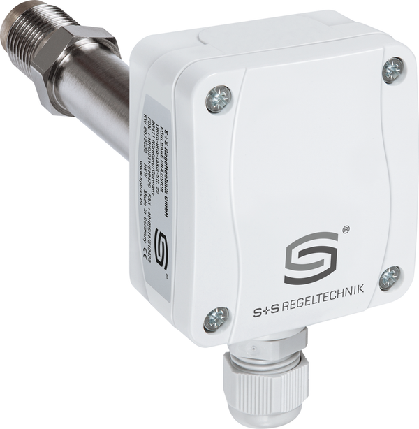 Kalibrierfähiger Einschraubfühler HYGRASGARD® ESFTF im Gehäuse aus schlagfestem Kunststoff mit Schnellverschlussschrauben, mit Kabelverschraubung ( optional M12-Steckverbinder nach DIN EN 61076-2-101), Kanalrohr mit Gewinde (G1/2") und Metall-Sinterfilter (austauschbar).