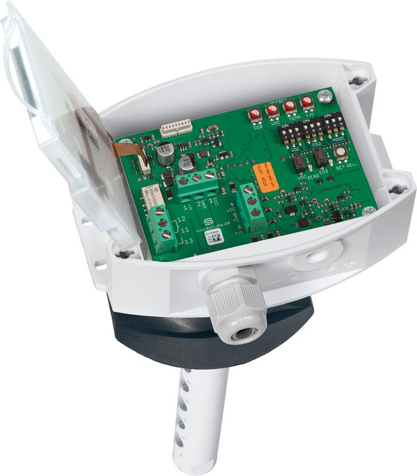 Wartungsfreier Kanalfühler AERASGARD® KTM - CO2 - SD mit aktivem Ausgang, automatischer Kalibrierung (fest eingestellt), im schlagfesten Kunststoffgehäuse mit Schnellverschlussschrauben, zur Ermittlung des CO2-Gehalts der Luft (0...2000 ppm / 0...5000 ppm) und der Temperatur (–35...+80 °C). Der Messumformer wandelt die Messgrößen in ein Normsignal von 0-10 V um.