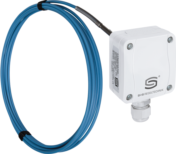 Mittelwerttemperaturfühler THERMASGARD® MWTF-SD (Rutenfühler 3 m/6 m) mit passivem Ausgang, im schlagfesten Kunststoffgehäuse mit Schnappdeckel, mit biegsamer Fühlerrute (vollaktiv), Schutzrohr aus verstärktem Thermoplastschlauch und Knickschutzfeder, incl. Montageflansch.