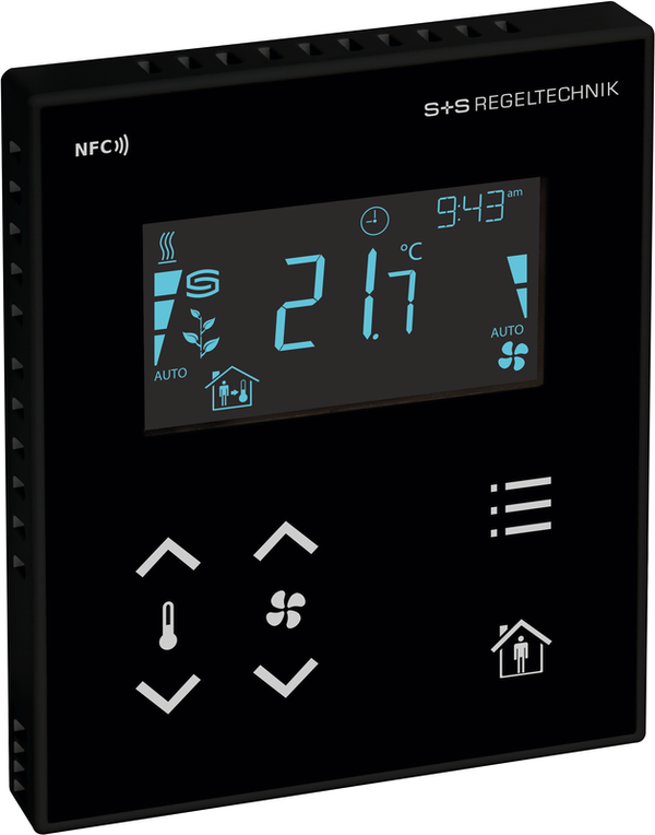Das speziell für die Raumbedienung konzipierte Multifunktionsdisplay ist dimmbar und bietet eine übersichtliche Anzeige aller verfügbaren Raumdaten mittels intuitiver Symbolik. Neben Uhrzeit, Datum und Klimaparametern (Temperatur, Feuchtigkeit, Taupunkt, CO2-Gehalt) können auch weitere Funktionen wie Lüfterbetrieb oder Raumbelegung dargestellt werden. Die Hintergrundbeleuchtung kann farblich an das Raumdesign angepasst werden.