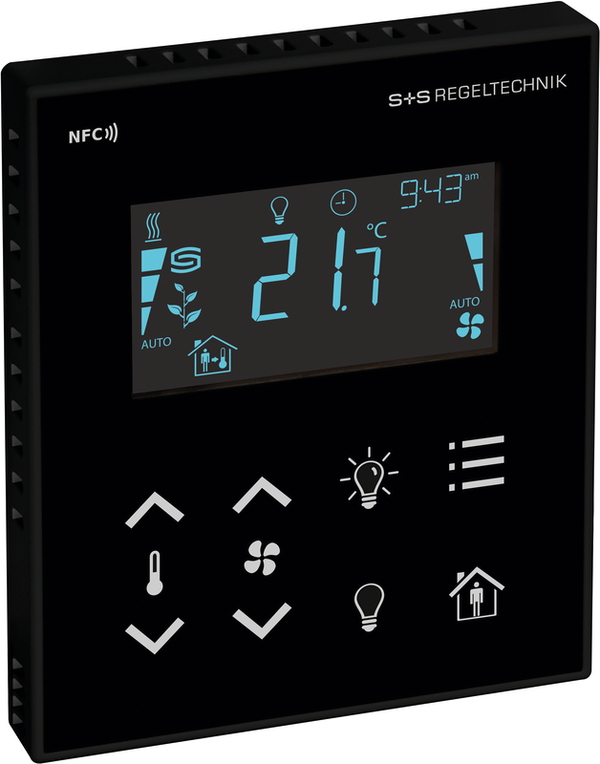 Das speziell für die Raumbedienung konzipierte Multifunktionsdisplay ist dimmbar und bietet eine übersichtliche Anzeige aller verfügbaren Raumdaten mittels intuitiver Symbolik. Neben Uhrzeit, Datum und Klimaparametern (Temperatur, Feuchtigkeit, Taupunkt, CO2-Gehalt) können auch weitere Funktionen wie Lüfterbetrieb oder Raumbelegung dargestellt werden. Die Hintergrundbeleuchtung kann farblich an das Raumdesign angepasst werden.