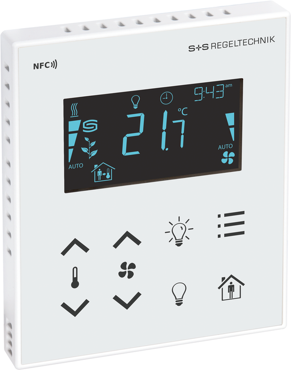 Das speziell für die Raumbedienung konzipierte Multifunktionsdisplay ist dimmbar und bietet eine übersichtliche Anzeige aller verfügbaren Raumdaten mittels intuitiver Symbolik. Neben Uhrzeit, Datum und Klimaparametern (Temperatur, Feuchtigkeit, Taupunkt, CO2-Gehalt) können auch weitere Funktionen wie Lüfterbetrieb oder Raumbelegung dargestellt werden. Die Hintergrundbeleuchtung kann farblich an das Raumdesign angepasst werden.