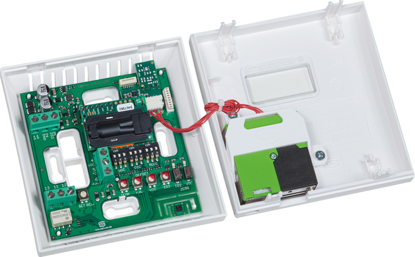 Необслуживаемый, многофункциональный датчик микроклимата в помещении AERASGARD® RFTM - PS - CO2 - W с активным/переключаемым выходом, автоматической калибровкой, в привлекательном пластиковом корпусе с защелкивающейся крышкой, нижняя часть с креплением на 4 отверстия, по выбору с/без дисплея, для регистрации измеряемых переменных влажности (0...100 % RH), температуры (0...+50°C), твердых частиц (PM) (0...50 / 100 / 300 / 500 мкг/м³) и содержания CO2 (0...2000 / 5000 ppm). Измерительный преобразователь преобразует измеряемую величину в стандартный сигнал 0-10 В или 4...20 мА (переключаемый).