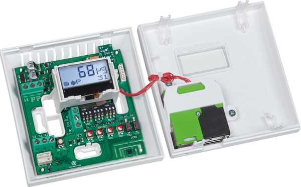 Необслуживаемый, многофункциональный датчик микроклимата в помещении AERASGARD® RFTM - PS - CO2 - W с активным/переключаемым выходом, автоматической калибровкой, в привлекательном пластиковом корпусе с защелкивающейся крышкой, нижняя часть с креплением на 4 отверстия, по выбору с/без дисплея, для регистрации измеряемых переменных влажности (0...100 % RH), температуры (0...+50°C), твердых частиц (PM) (0...50 / 100 / 300 / 500 мкг/м³) и содержания CO2 (0...2000 / 5000 ppm). Измерительный преобразователь преобразует измеряемую величину в стандартный сигнал 0-10 В или 4...20 мА (переключаемый).